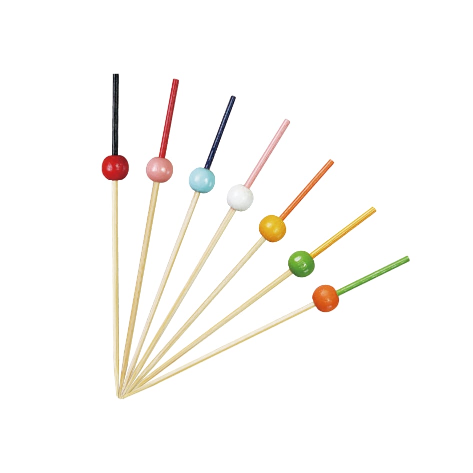 落ち着いた色合いの珠かんざし串をポップないろどりに仕上げた綾珠かんざし串。珠の位置も下にあり、色のコントラストがお料理を一層引き立てます。 お料理・お菓子・くだもの等、用途に合わせて ピンチョスパーティー、ケータリングでも大人気。 お弁当のアクセントにも。 径:1.6㎜ 長さ:7.5cm / 9cm / 12cm 入数:50本入 材質:天然竹 仕上げ:ウレタン塗装